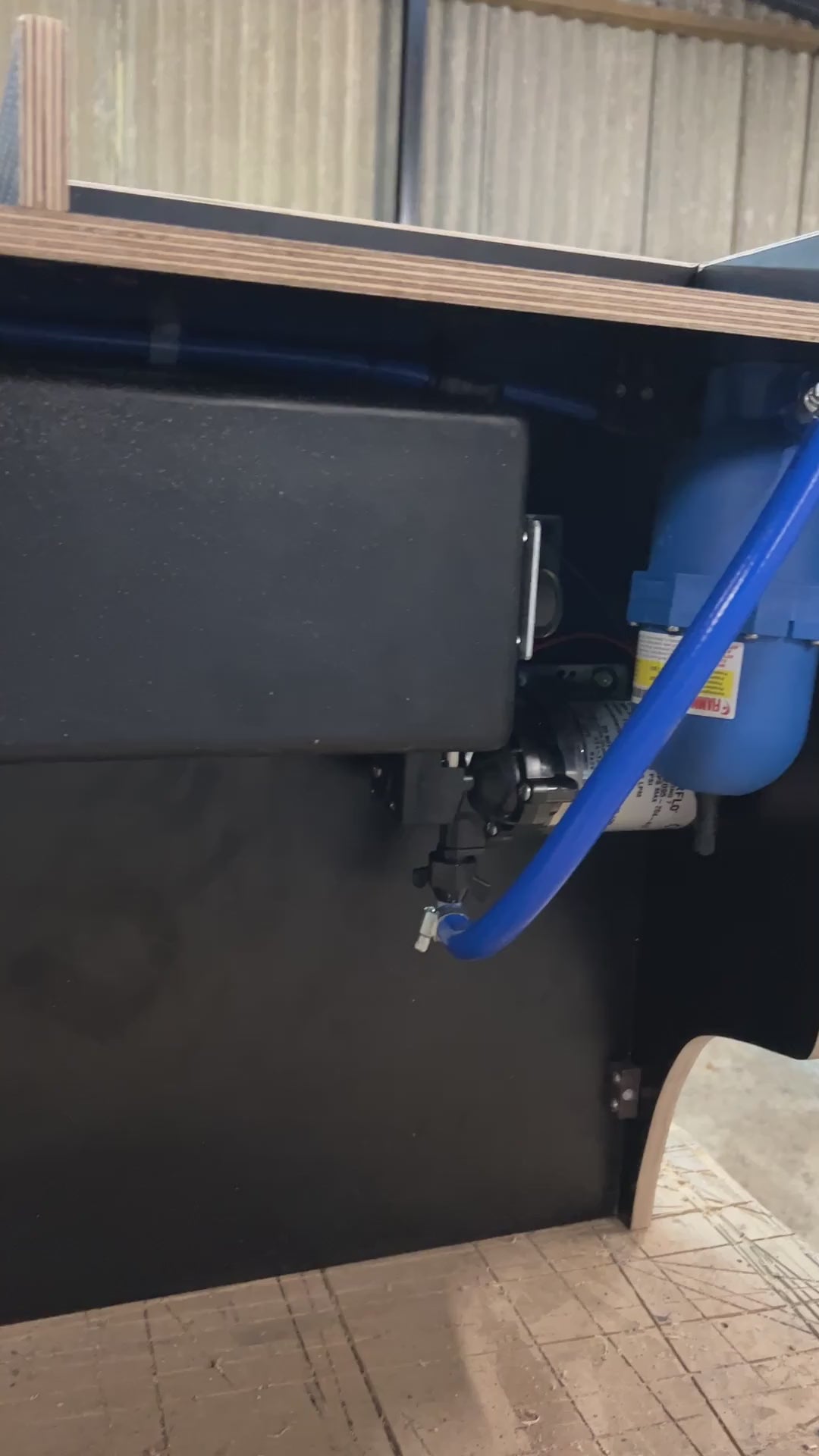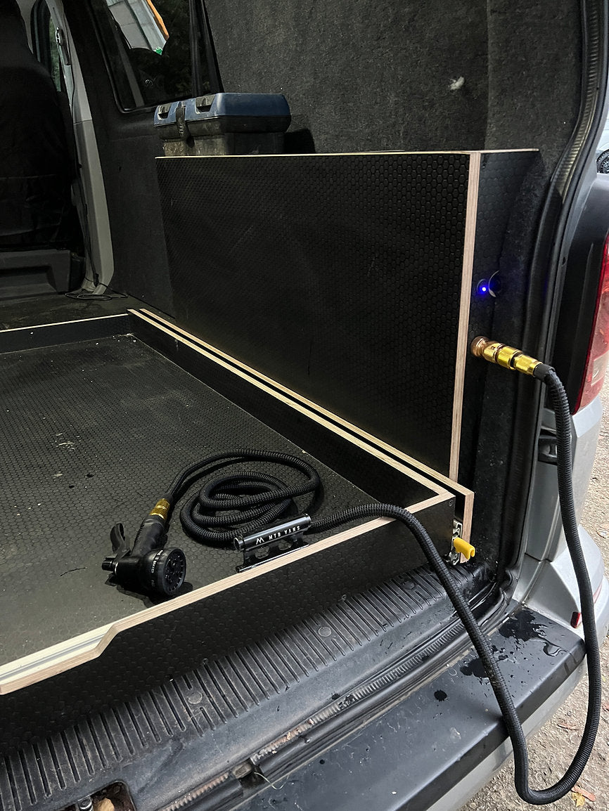 Built to fit neatly in the rear right hand corner of a VW Transporter (T5-T6.1) this discreet solution hides a 25L water tank, 12v high pressure water pump, pressure vessel and all pipe work inside whilst doubling up as a handy storage shelf for tool boxes, riding shoes, knee pads etc.