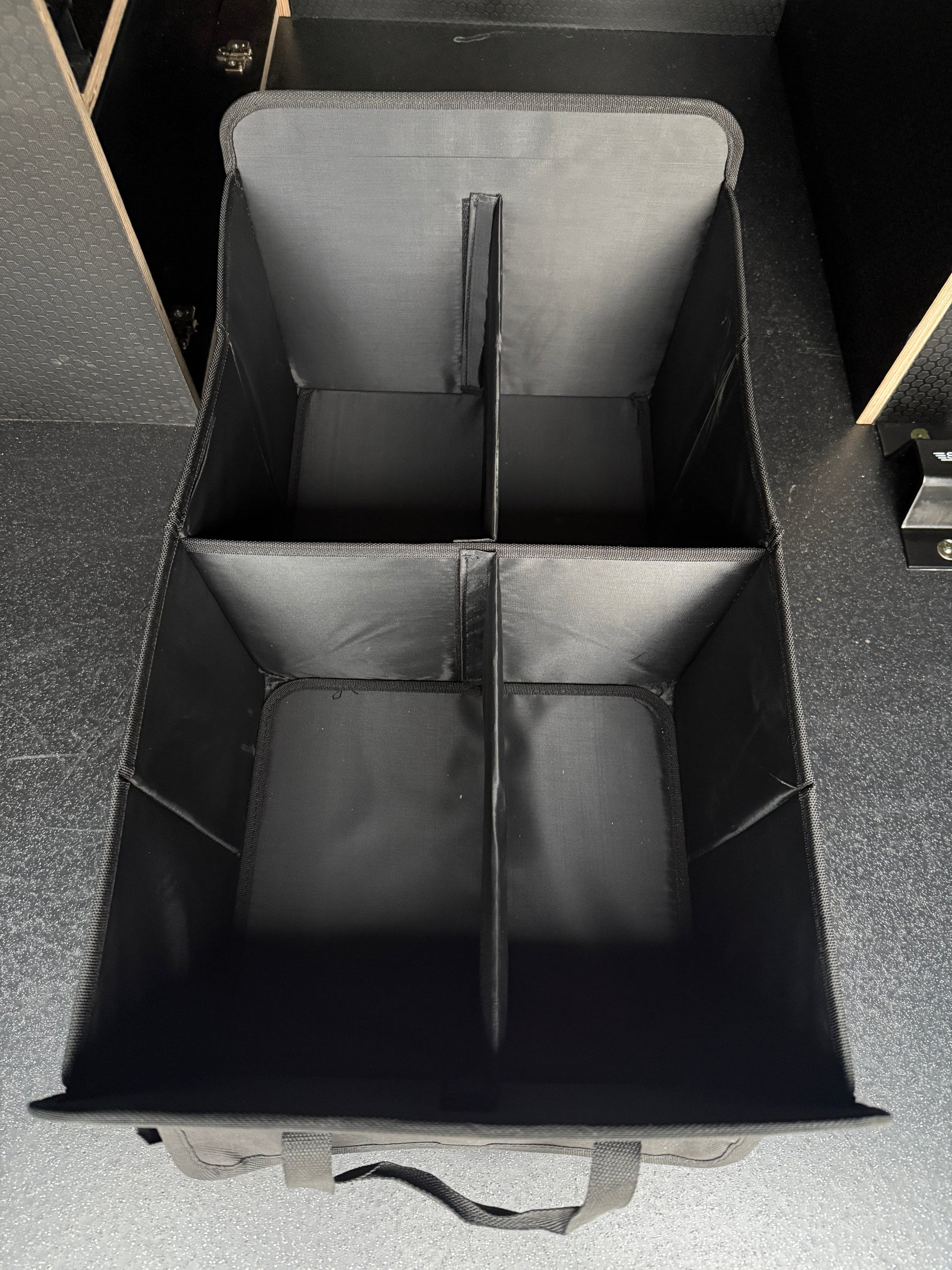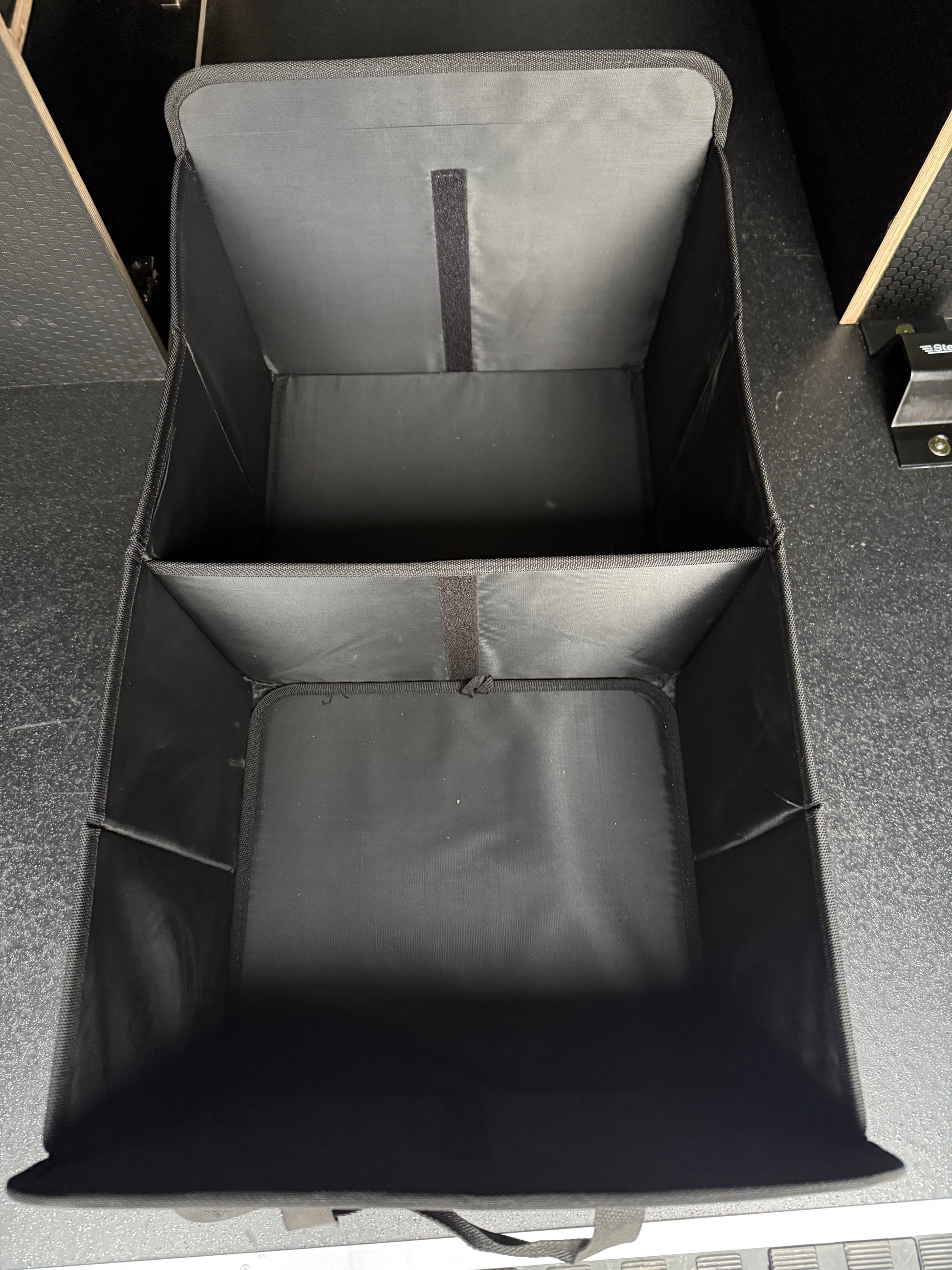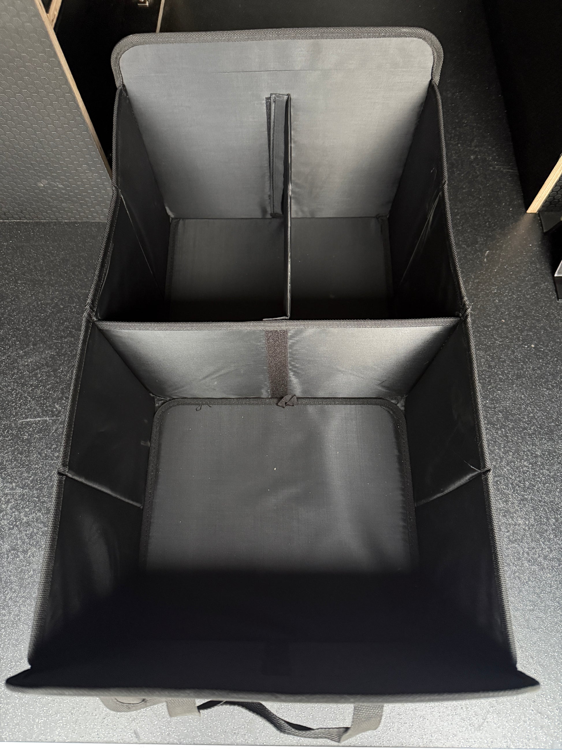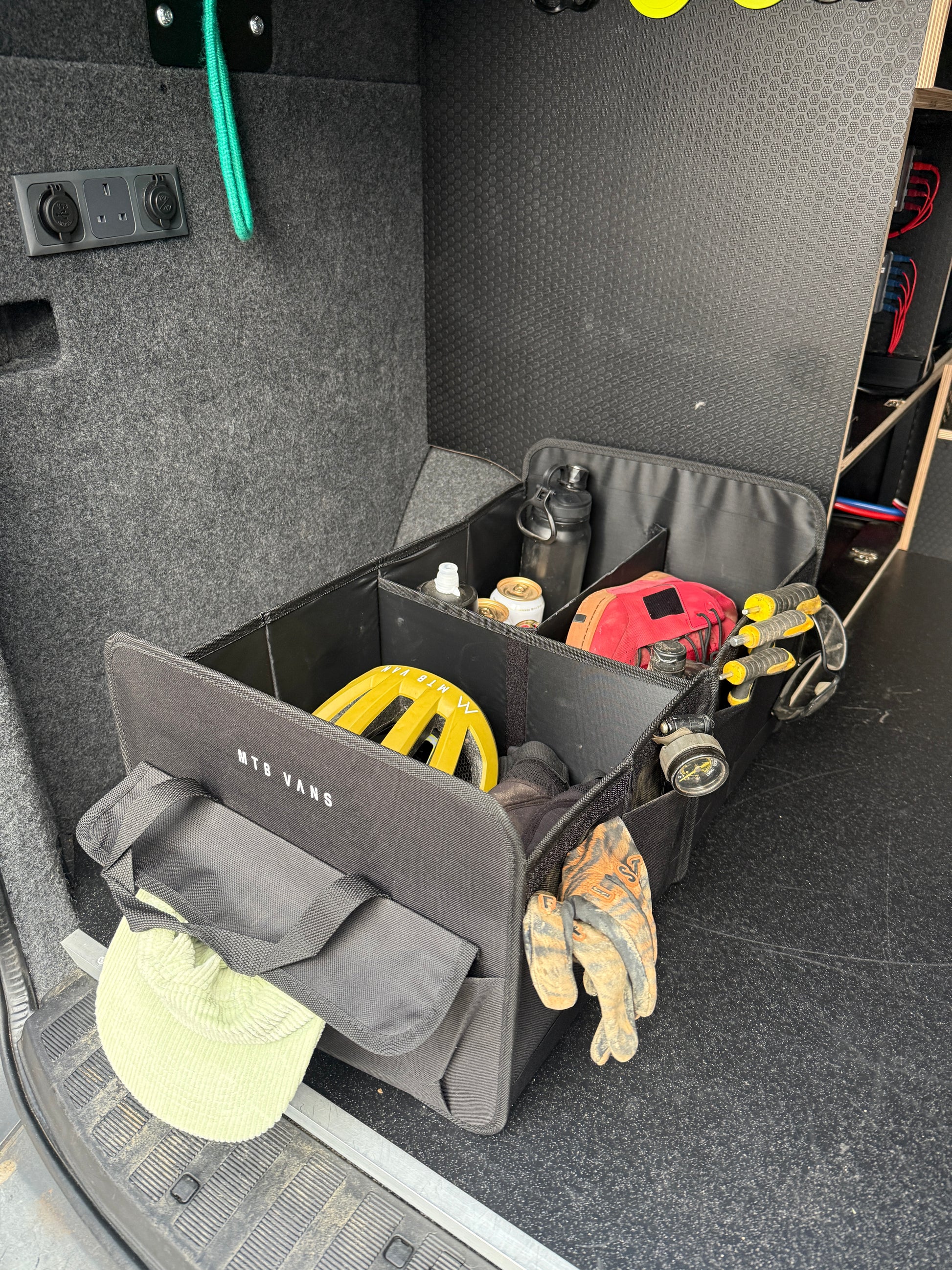 The Stash Box. As we continue in our quest to keep your gear organised in the back of your van or more appropriately in this case, your car, we bring you, the Stash Box! If your vehicle of choice doesn't have doors available for one of our Stash Bags, or you just want even more storage options then this is ideal for you. With 2 large compartments which can be separated with the removable dividers, pockets to the side and velcro pockets to the front and rear, this gives you plenty of space to keep all your kit organised on the way too and from the trails. It then folds away beautifully for when organising the chaos of your kit isn't required.